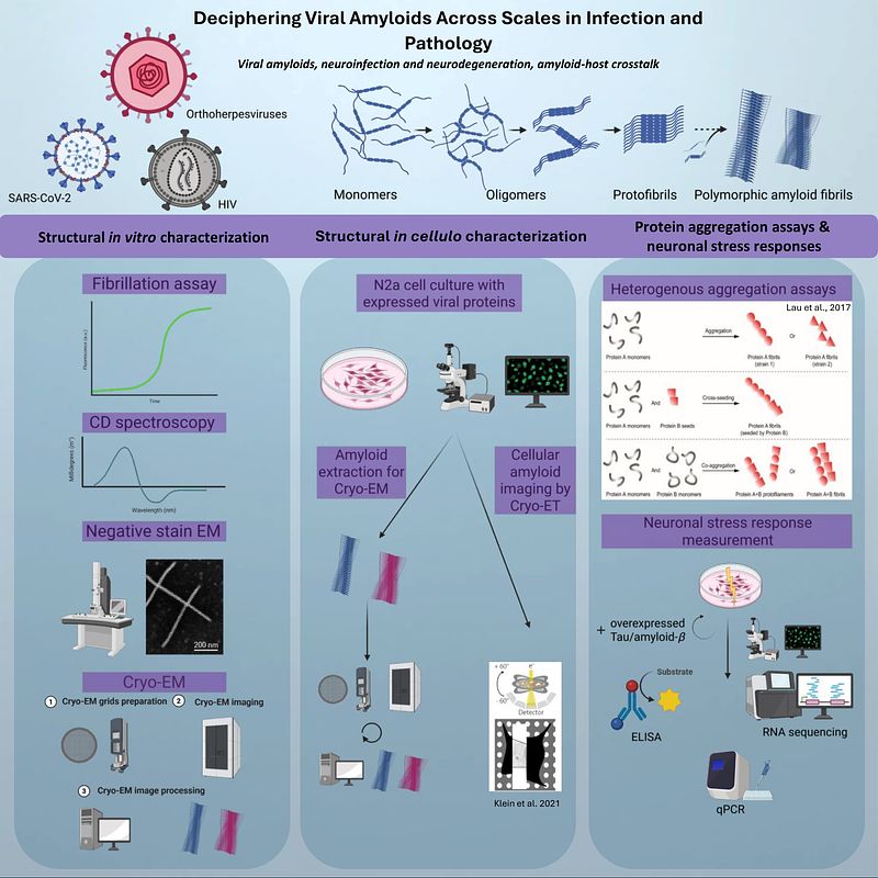 Amyloids, long regarded as disease-linked aggregates, serve functional roles across life, including viruses, yet molecular insights remain limited. In this project, I lays the foundation to decipher the viral-host amyloid crosstalk by characterizing amyloid-prone targets across viral families using structural, biochemical, and cellular approaches. Focusing on neurotropic viruses, I assess whether viral targets cross-aggregate tau/Aβ and trigger neuronal stress, offering mechanistic evidence for the neuroinfection-neurodegeneration link and guiding therapies against infection and neurodegeneration.